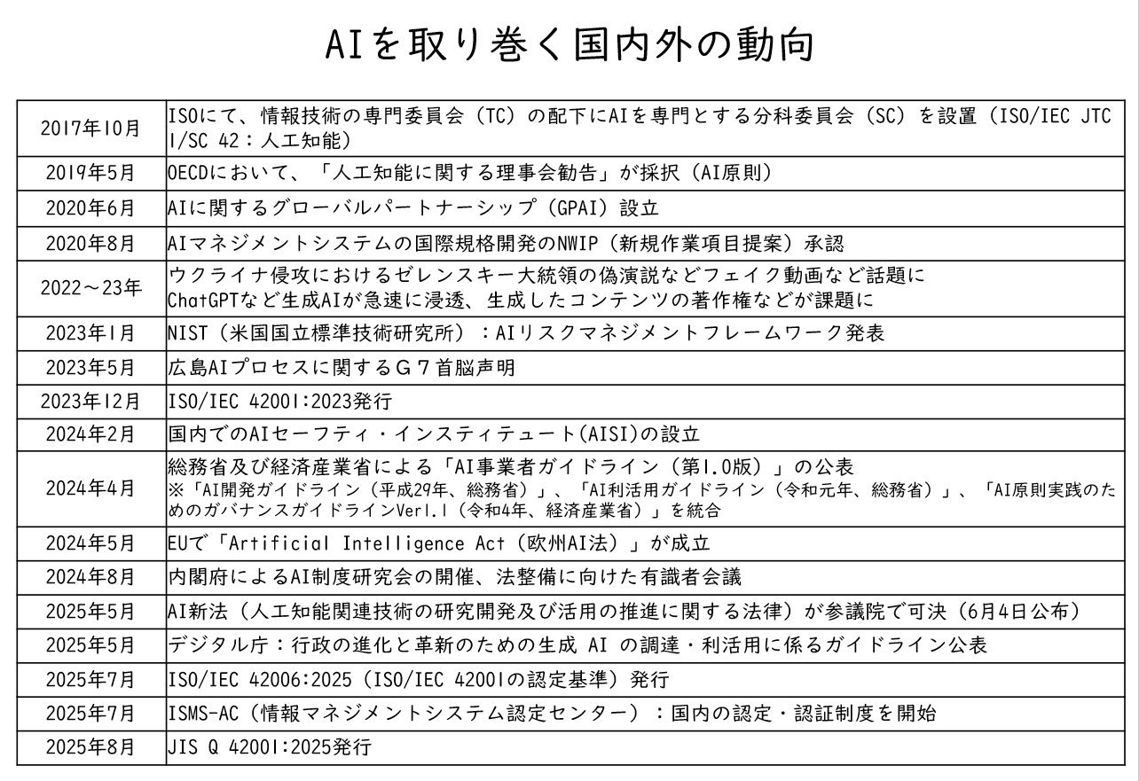 2025年7月には、ISO(国際標準化機構)のISO/IEC JTC 1/SC 42:Artificial intelligence(人工知能)によってISO 42001の認定基準である、ISO 42006:2025が発行された。それによって、同月、国内の認定機関であるISMS-AC(情報マネジメントシステム認定センター)が、ISO 42001の認定・認証制度を開始した。