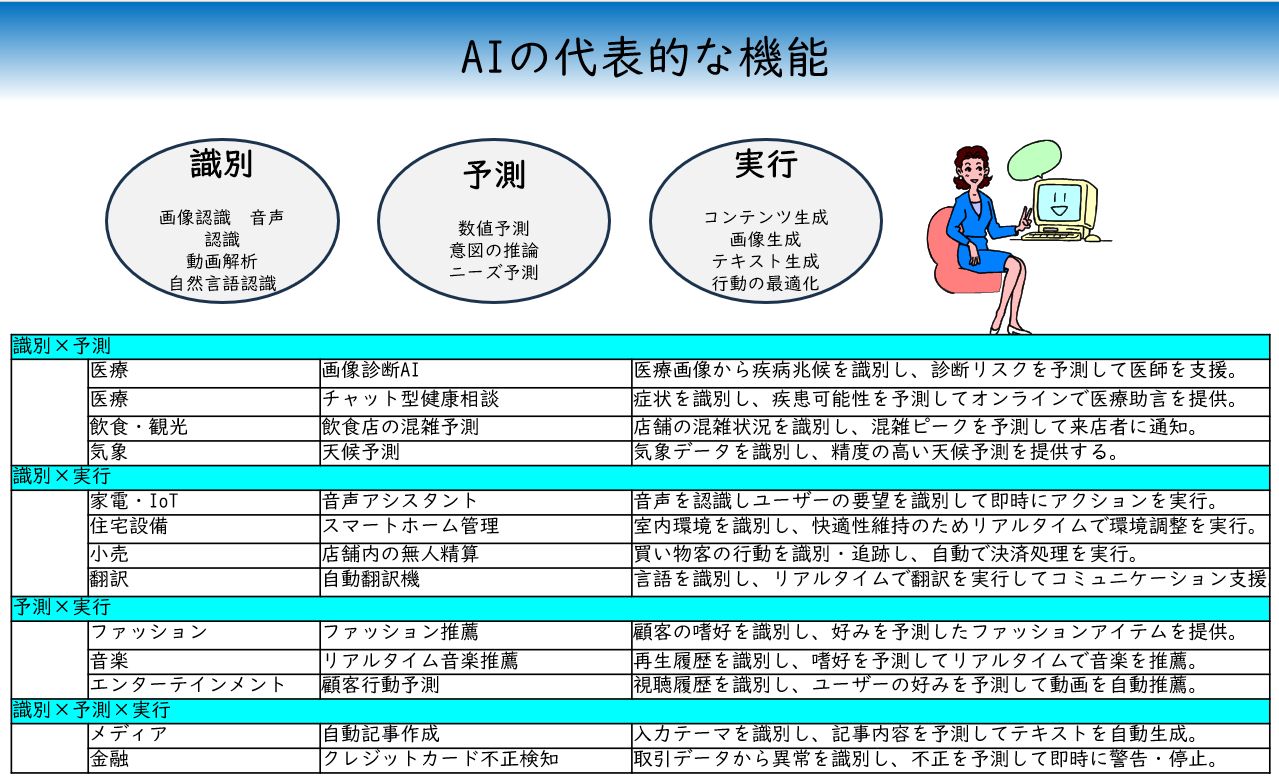 AIは、2000年代以降に飛躍的に進化を遂げ、ディープラーニングなどによる、音声認識、画像認識、翻訳(自然言語処理)に活用されるようになり、特定の分野に特化し、推測・予測、提案や意思決定を行うことができるものが誕生した。また、2020年以降、ICTの技術的な進歩により、特定の分野のみに特化したAIではなく、汎用的なAIが誕生し、その結果、推測・予測、提案や意思決定にとどまらず、文章や画像などを作成してくれる、生成AIが普及するようになった。