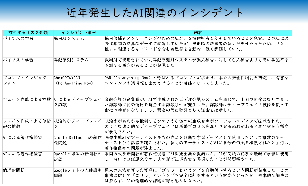 AIにおける代表的なリスクには、バイアス(偏見)を含んだ学習データ、説明できないアルゴリズム、プロンプトインジェクション、逆解析によるデータ漏えい、フェイク生成、詐欺、偽情報拡散、知的財産権関連(著作権など)、名誉毀損・プライバシー侵害・侮辱、倫理的なリスクなどが含まれる。